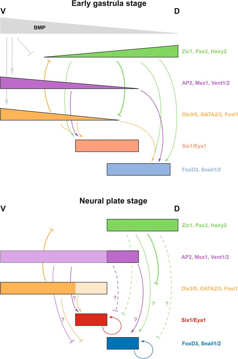 Fig. 7 A model for the establishment of PPE and NC at the NPB. Spatial distribution of expression levels of TFs in the ectoderm from dorsal (D) to ventral (V) is shown at the beginning of gastrulation (upper panel) and after completion of gastrulation (lower panel). Faint colors indicate weak expression. TFs are grouped according to shared expression patterns. BMP activity levels are also shown for the early stage. Arrows indicate positive regulatory relationships, while lines with bars indicate negative regulatory relationships. Solid lines indicate relationships that have been verified in loss of function (and usually also in gain of function) experiments, while hatched lines indicate relationships that are only supported by gain of function experiments. Temporal changes of regulatory relationships are proposed based on changing TF expression patterns.The context-dependent regulation of Six1 and Eya1 as well as of FoxD3 by Dlx3 and Zic1 is shown by converging arrows. The question marks in the lower panel indicate that TFs probably cooperate with other as yet unknown factors in a context-dependent way to either activate or repress target genes. Cross-regulation of TFs by Six1 and Eya1 is not depicted for clarity. See text for details. |