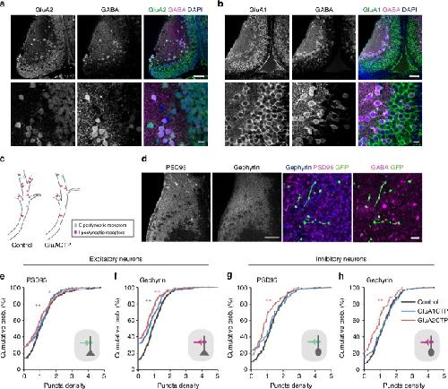 Fig. 2. Decreased excitatory inputs induced cell-autonomous decreases in inhibitory synaptic inputs in both excitatory and inhibitory neurons. a, b Co-immunolabeling of GABA and GluA2 (a) or GluA1 (b) antibodies shows that both GluA1 and GluA2 are widely expressed in the tectum and are found in both excitatory (GABA-negative) and inhibitory (GABA-positive) neurons. Scale bar: top: 50âμm; bottom: 10âμm. c Schematic illustrates excitatory and inhibitory synapses on excitatory and inhibitory postsynaptic neurons. d PSD95 and gephyrin immunolabeling in the tectum (left) show high puncta density in the neuropil and relatively low density in the somatic region. Right: representative images of PSD95 and gephyrin puncta in a GFP+ dendritic segment. The identity (excitatory or inhibitory) of the GFP+ dendrite was determined by GABA immunolabeling. Scale bar: left: 50âμm; right: 10âμm. e- h Summary data showing GluA1CTP and GluA2CTP decreased both PSD95 (e) and gephyrin (f) puncta density in excitatory dendrites (number of dendritic segments: Control: nâ=â250; GluA1CTP: nâ=â170; GluA2CTP: nâ=â210). In inhibitory dendrites, GluA2CTP, but not GluA1CTP, significantly decreased PSD95 (g) and gephyrin (h) puncta density (number of dendritic segments: Control: nâ=â134; GluA1CTP: nâ=â54; GluA2CTP: nâ=â49). *Pâ<â0.05; **Pâ<â0.01; KruskalâWallis test with posthoc MannâWhitney U test |