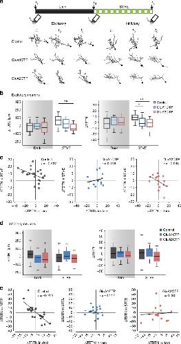 Fig. 4. GluACTP expression disrupts experience-dependent structural plasticity in excitatory and inhibitory neurons. a Representative images of complete dendritic arbor reconstructions from time-lapse images taken before (T1) and after (T2) 4âh of dark, and after 4âh of STVE (T3) of individual excitatory and inhibitory neurons in each group. Top: schematic shows the experimental protocol and imaging time course. b Summary data of changes in TDBL (ÎTDBL) and TBTN (ÎTBTN) during the dark and STVE periods in excitatory neurons. GluA1CTP and GluA2CTP significantly decrease STVE-induced dendritic arbor growth. *Pâ<â0.05, **Pâ<â0.01, KruskalâWallis test with post hoc MannâWhitney U test. c Scatter plots of ÎTBTN in response to STVE versus dark in individual excitatory neurons. Rho value of Pearson correlation is shown on each plot. d Summary data of ÎTDBL and ÎTBTN during dark and STVE periods in inhibitory neurons. e Scatter plots of ÎTBTN in response to STVE versus dark in individual inhibitory neurons |