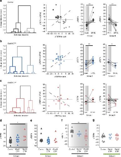 Fig. 5. GluA2CTP expression disrupted the bimodal experience-dependent structural plasticity of inhibitory neurons. a Left: Dendrogram of unsupervised hierarchical cluster analysis of control inhibitory neurons based on changes in TBTN (ÎΤÎΤÎ) in STVE versus dark. Middle: Scatter plots of ÎTBTN in response to STVE versus dark in individual neurons for Group I and II inhibitory neurons. Right: Summary of ÎTBTN in dark and STVE for control Group I and II neurons. b Cluster analysis of GluA1CTP-expressing inhibitory neurons. c Cluster analysis of GluA2CTP-expressing inhibitory neurons. *Pâ<â0.05, **Pâ<â0.01, Wilcoxon sign rank test. d, g Summary data of ÎTBTN in response to dark (d, f) and STVE (e, g) in Group I (d, e) and Group II (f, g) inhibitory neurons. *Pâ<â0.05, KruskalâWallis test with post hoc MannâWhitney U test |