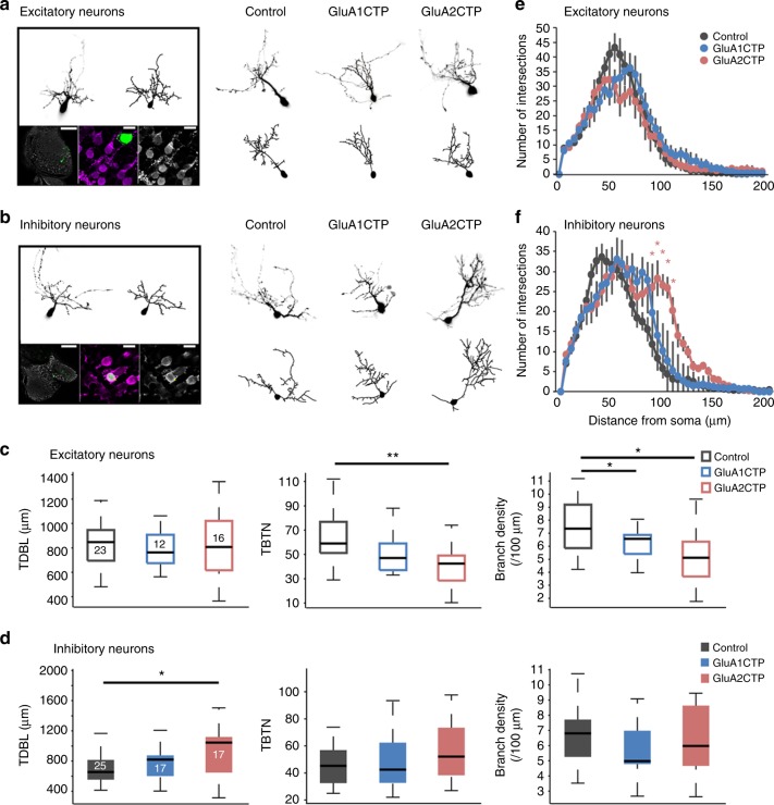 Fig. 3. GluACTPs differentially affect dendritic arbor growth in excitatory and inhibitory neurons. a, b Representative images of excitatory (a) and inhibitory (b) neurons. Left panel: Example of the live image and reconstructed full dendritic arbor of an individual neuron (top). Post hoc GABA immunolabeling (bottom) of the same neuron. Green, GFP; gray/magenta, GABA. Scale bar: left 100âμm; middle and right 10âμm. Right panel: Representative live images (top) of inhibitory neurons expressing GFP only (control), GluA1CTP, or GluA2CTP, and reconstructed complete dendritic arbors (bottom). c, d Summary data of total dendritic branch length (TDBL), total branch tip number (TBTN), and branch density control, GluA2CTP- and GluA1CTP-expressing excitatory (c) and inhibitory (d) neurons. *Pâ<â0.05, KruskalâWallis test with post hoc MannâWhitney U test. Number of neurons in each group is shown in the graph. e, f Sholl analysis: neither GluA1CTP nor GluA2CTP affected dendritic arbor branching pattern in excitatory neurons (e). GluA2CTP but not GluA1CTP significantly increased branch density distal to the soma in inhibitory neurons (f) compared to controls. *Pâ<â0.05, **Pâ<â0.01, KruskalâWallis test with post hoc MannâWhitney U test |