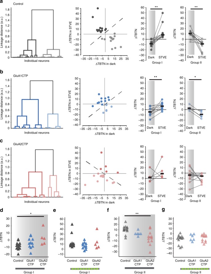 Fig. 6. Cluster analysis of experience-dependent changes in TBTN in individual excitatory neurons. a Left: Dendrogram of unsupervised hierarchical cluster analysis of control excitatory neurons based on ÎTBTN in STVE versus dark. Middle: Scatter plots of ÎTBTN in response to STVE versus dark in individual neurons for Group I and II excitatory neurons. Right: Summary of ÎTBTN in dark and STVE for Group I and II control neurons. b Cluster analysis of GluA1CTP-expressing excitatory neurons. c Cluster analysis of GluA2CTP-expressing excitatory neurons. *Pâ<â0.05, **Pâ<â0.01, Wilcoxon sign rank test. d- g Summary data of ÎTBTN in response to dark (d, f) and STVE (e, g) in group I (d, e) and group II (f, g) excitatory neurons. *Pâ<â0.05, KruskalâWallis test with post hoc MannâWhitney U test |