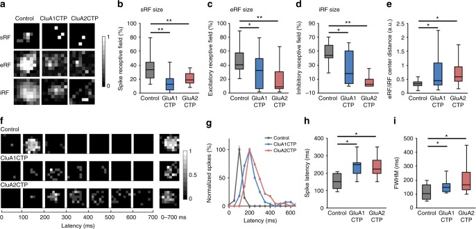 Fig. 7. GluACTP expression disrupts spatial and temporal receptive visual field properties. a Representative maps of spiking RFs (sRFs), excitatory RFs (eRFs), and inhibitory RFs (iRFs) in control, GluA1CTP- and GluA2CTP-expressing neurons. b-d Both GluA1CTP and GluA2CTP expression significantly decreased the size of sRF (b, nâ=â28, 14, 8), eRF (c, nâ=â18, 19, 20), and iRF (d, nâ=â18, 12, 13). e The distances between eRF and iRF centers were significantly larger in GluA1CTP- and GluA2CTP-expressing neurons. f Representative tRF maps in control, GluA1CTP- and GluA2CTP-expressing neurons. g Plot of spike numbers over the 700âms recording period normalized to peak spike numbers per 100âms bin. The control tRF is limited to the first 200âms while tRFs in GluA1CTP- and GluA2CTP-expressing neurons were significantly extended and delayed. h, i Both spike latency (h) and the full width at half maximum (FWHM, i) of the tRF spiking response increased significantly in GluA1CTP- and GluA2CTP-expressing neurons compared to control neurons. Control: nâ=â12; GluA1CTP: nâ=â9; GluA2CTP: nâ=â8. *Pâ<â0.05, **Pâ<â0.01. ANOVA with NewmanâKeuls test |