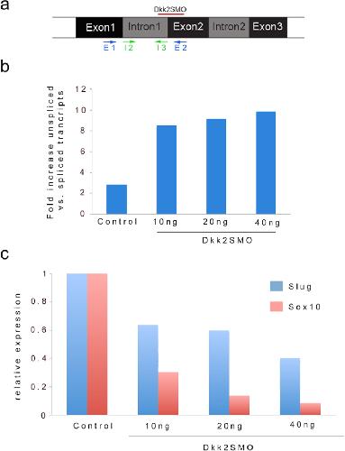 Figure 1—figure supplement 1 Quantification of unspliced vs. spliced transcripts in MO-injected embryos. (a) Schematic representation of the dkk2 locus. The position of the splice blocking MO (Dkk2SMO) is shown (red line). The PCR primers used to analyze the spliced (E1/E2) and unspliced (I2/I3) transcripts are indicated. (b) qRT-PCR analysis of fold increase in unspliced (intron one retention) vs. spliced transcripts upon injection of increasing doses of MO. (c) Increasing amount of MO resulted in a dose-dependent decrease in snai2 and sox10 expression in these embryos. A representative experiment is shown. |