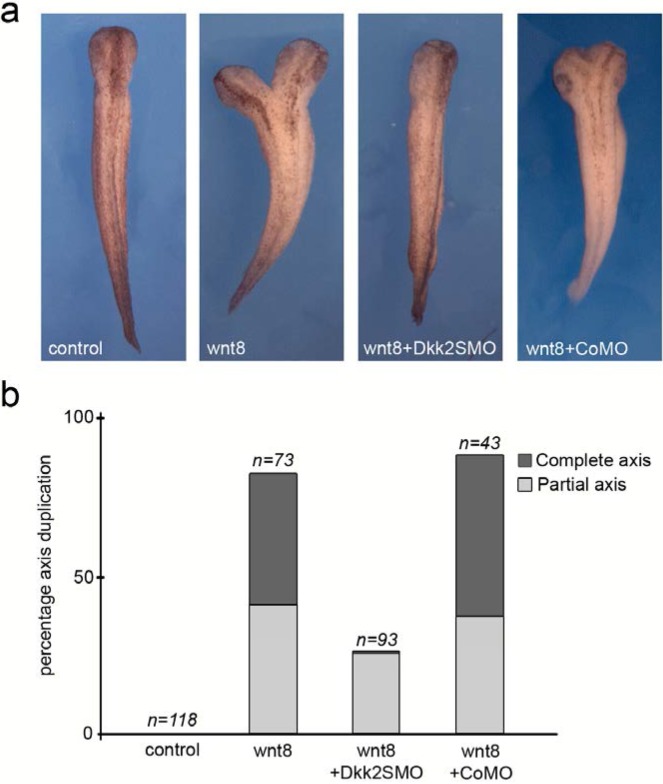 Figure 9—figure supplement 1. Dkk2 function is required for dorsal axis duplication by Wnt8.(a) Ventral injection of wnt8 mRNA (50 pg) in the equatorial region of 4 cell stage embryos resulted in secondary dorsal axis formation at stage 30. Injection of Dkk2SMO (30 ng) significantly reduced dorsal axis duplication by Wnt8. A CoMO (30 ng) did not interfere with Wnt8 dorsal axis duplication activity. Dorsal views, anterior to top. (b) Percentage of axis duplication (complete, include head structures) in different experimental conditions from three independent experiments. The number of embryos analyzed (n) is indicated on the top of each bar. |