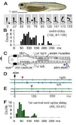 Figure 1. Response times to the first flexion and ventral root burst of swimming to current pulse trunk skin stimulation. A, Xenopus tadpole with stimulus site marked (*) and frames from a video (stimulus at t = 0 ms). The tadpole (supported by pins in neck region) flexes to unstimulated left side starting at 76 ms (arrowhead) and swims off. B, Distribution of delays to the start of the 1st flexion of swimming. C, Diagram of immobilised tadpole with stimulating and ventral root (vr) recording electrodes. D, E, Motor nerve responses to 0.1 ms pulse to trunk skin (â) to show when swimming started on the right, unstimulated side (red arrowheads). F, Distribution of delays to the first ventral root spikes when swimming started on the unstimulated side. Figures on graphs are median and IQR. |