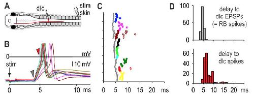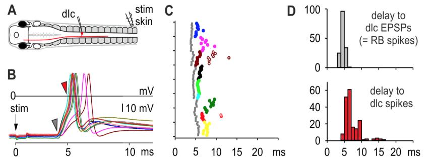 Figure 2. Firing times in sensory pathway dlc neurons following a trunk skin stimulus. A Diagram to show the location of electrodes and the recorded neuron. B Ten superimposed responses in a dlc. Delays to the EPSP (grey arrowheads) give the sensory RB spike times and dlc spikes are clear (red arrowheads). C Spike time raster plots for RBs (grey blocks) and dlcs (coloured circles: 1st spikes filled, 2nd/3rd spikes open; N = 9 dlcs). D Spike latency plots of RBs and dlcs. |