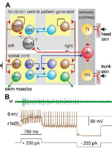 Figure 3. The tadpole swimming network and role of reticulospinal hdIN neurons