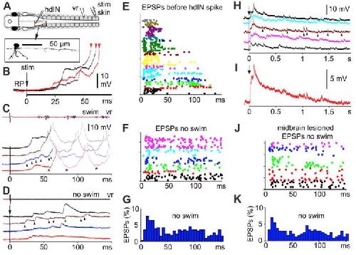 Figure 5. Summation of EPSPs to firing threshold in reticulospinal hdINs following a trunk skin stimulus on the opposite side. A, Neurobiotin fill of the neuron in the left caudal hindbrain recorded in B-D. (Box location as in Fig. 4A.) B, Three superimposed responses (from C) to contra-lateral stimuli evoking swimming show the noisy rise of excitation towards spike threshold (spike onsets marked by red arrowheads). C, D, Recordings show variability in EPSP summation in responses to trunk skin stimulation just above C and below D swim threshold (see ventral root vr). Arrowheads mark example EPSPs and responses are offset for clarity. Asterisks mark artifacts due to spikes in another hdIN recording electrode on the other side. E, F, Raster plots of EPSP latencies in response to skin stimuli at t = 0 where each colour is a different hdIN and each row is a different response. E, EPSPs up to the time of the first hdIN spike of swimming (14 hdINs). F, EPSPs to stimuli below swimming threshold (6 hdINs), persist for more than 150 ms after the stimulus. G, EPSP latency distributions for responses in F. H, Slower time scale recordings show long duration of responses below swim threshold. Arrowheads mark example EPSPs. I, The long duration of the excitation is clear from an average of the 5 responses in H. J, K, Raster plots and distributions of EPSP latencies (like F, G) in animals with the midbrain removed. |