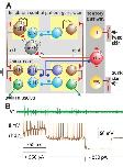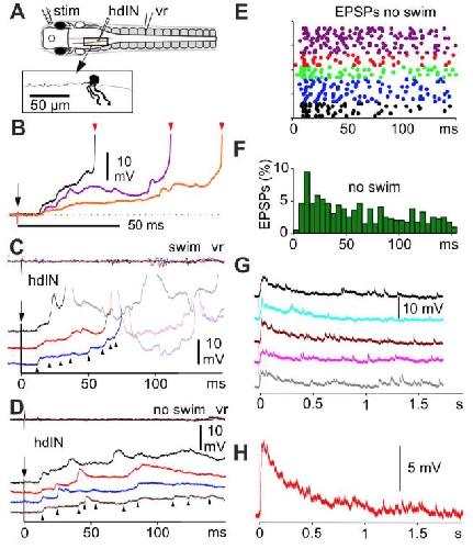 Figure 6. Summation of EPSPs to firing threshold in reticulospinal hdINs following a head skin stimulus on the opposite side. A, Diagram to show the location of electrodes. The inset is the hdIN neuron recorded in C, D. B- C, Responses of hdINs to head skin stimulation (at arrow). B, Three superimposed responses from different neurons leading to firing (red arrowheads). Dots show resting potential. C, D. Responses of hdIN in A to stimuli above (C) and below (D) threshold for the hdIN spike and swimming (see top vr traces). (C, D) Arrowheads mark example EPSPs. E, Raster plot of EPSP latencies from 5 hdINs (different colours) over the first 150 ms after the stimulus when swimming did not occur. F, EPSP latency distributions for responses in E. G, Slower time scale recordings of responses below swim threshold show the prolonged responses in another hdIN. H, An average of responses in G. |