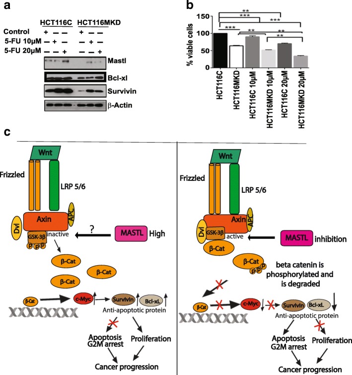 BACKGROUND: Chemotherapeutic agents that modulate cell cycle checkpoints and/or tumor-specific pathways have shown immense promise in preclinical and clinical studies aimed at anti-cancer therapy. MASTL (Greatwall in Xenopus and Drosophila), a serine/threonine kinase controls the final G2/M checkpoint and prevents premature entry of cells into mitosis. Recent studies suggest that MASTL expression is highly upregulated in cancer and confers resistance against chemotherapy. However, the role and mechanism/s of MASTL mediated regulation of tumorigenesis remains poorly understood. METHODS: We utilized a large patient cohort and mouse models of colon cancer as well as colon cancer cells to determine the role of Mastl and associated mechanism in colon cancer. RESULTS: Here, we show that MASTL expression increases in colon cancer across all cancer stages compared with normal colon tissue (P < 0.001). Also, increased levels of MASTL associated with high-risk of the disease and poor prognosis. Further, the shRNA silencing of MASTL expression in colon cancer cells induced cell cycle arrest and apoptosis in vitro and inhibited xenograft-tumor growth in vivo. Mechanistic analysis revealed that MASTL expression facilitates colon cancer progression by promoting the β-catenin/Wnt signaling, the key signaling pathway implicated in colon carcinogenesis, and up-regulating anti-apoptotic proteins, Bcl-xL and Survivin. Further studies where colorectal cancer (CRC) cells were subjected to 5-fluorouracil (5FU) treatment revealed a sharp increase in MASTL expression upon chemotherapy, along with increases in Bcl-xL and Survivin expression. Most notably, inhibition of MASTL in these cells induced chemosensitivity to 5FU with downregulation of Survivin and Bcl-xL expression. CONCLUSION: Overall, our data shed light on the heretofore-undescribed mechanistic role of MASTL in key oncogenic signaling pathway/s to regulate colon cancer progression and chemo-resistance that would tremendously help to overcome drug resistance in colon cancer treatment.