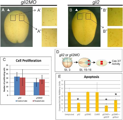 Fig. 7. gli2 is involved in the apoptosis of NCC but not in their proliferation. (AâB) Dorsal views of Xenopus laevis embryos, anterior side to the top. White arrowheads indicate the injected side. Gain- and loss-of-function of gli2 did not alter the number of proliferating cells between the injected and the control side. (Aâ², Aâ², Bâ², Bâ²) Insets showing the quantified area of each embryo. (C) Quantification of proliferating cells in the embryos treated with gli2 mRNA or gli2MO. (D) Schematic diagram showing the approach used to evaluate the apoptosis status of NCC. (E) Graph showing that the overexpression of gli2 prevents NCC from undergoing normal apoptosis. The inhibition of gli2 expression did not produce any significant changes in the apoptosis level of NCC. The activator form of Gli2 also decreased apoptosis in NC explants. Values are meanâ¯Â±â¯s.d. from two independent experiments. Pâ¯â¤â¯0.05 (Student's t-test). |