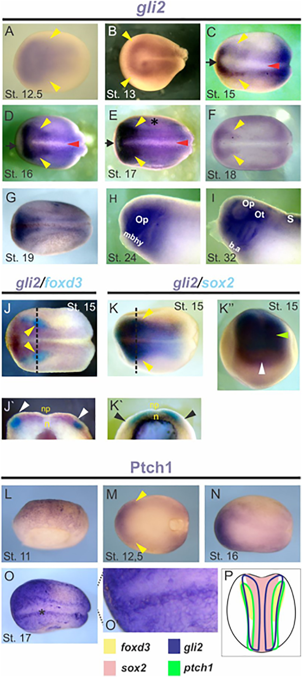 Fig. 1. gli2 and Ptc1 expression patterns in Xenopus embryos. (AâG, JâK, MâO) Dorsal views of Xenopus laevis embryos, anterior side on the left. (L) Dorsal view, anterior side at the top. (Jâ², Kâ²): Transversal sections, dorsal side at the top. (HâI) Lateral views, anterior side on the left. (Kâ²) Anterior view. (AâB) gli2 is expressed in the dorsolateral region of the embryo at stages 12.5 and 13 (yellow arrowheads). (CâD) gli2 transcripts are detected in the NPB at early neurula stage (yellow arrowheads) and in the anterior NP (black arrow). No expression can be observed in the dorsal midline (red arrowhead) (EâG). From stage 17 to 19, gli2 becomes more prominent in the lateral and anterior NPB. (HâI) At tailbud stages, gli2 is expressed in the mandibular (mb) and hyoid (hy) NC streams, in the branchial arches (b.a.), in the otic (Ot) and optic (Op) vescicle and in the presomitic mesoderm (S). (JâK) Double ISH showing gli2 expression with two gene markers. (JâJ') gli2 is expressed in an overlapping territory with the NC marker foxd3. (KâKâ²) The domain of gli2 expression extends laterally from the NP, as evidenced by the double ISH with sox2 in whole embryos. (Kâ²) Anterior view showing that the expression of gli2 extends mores anteriorly than that of sox2. (L) At the late gastrula stage, Ptch1 is expressed in the dorsal side of the blastopore. (MâO) At neurula stages, Ptch1 can be detected in the NPB and in the neural folds. (Oâ²) Expression of Ptch1 in the cell membranes of ectodermal cells. (P) Diagram representing the expression domains of the Ptch1 protein (green) and the genes gli2 (blue), foxd3 (light yellow) and sox2 (pink). |
