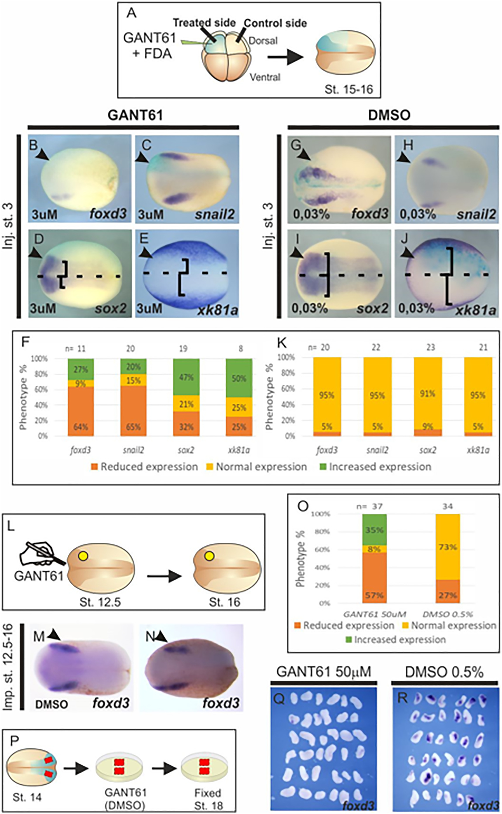 Fig. 4. gli2 requirement for the maintenance of NC specification. (BâE, GâJ, MâN) Dorsal views of Xenopus laevis embryos at midneurula stage; anterior side is on the left. Arrowheads indicate the injected or implanted side. (AâE) GANT61 injection at stage 3 produces a decrease in the expression of foxd3 and snail2, with a concomitant increase in the expression of sox2 and xk81a. (F) Quantification of phenotypes in the injected embryos of figures BâE. (GâJ) Injection of the GANT61 diluent (DMSO 0,03%) produced no changes in the expression of the gene markers analyzed. (K) Quantification of phenotypes. (LâO) Implanted GANT61-soaked beads from stage 12.5 to 16 produced a reduction in foxd3 expression, as opposed to the implantation of DMSO-soaked beads. (PâR) NC explants with mesoderm incubated in GANT61 from stage 14â18 lose foxd3 expression. |