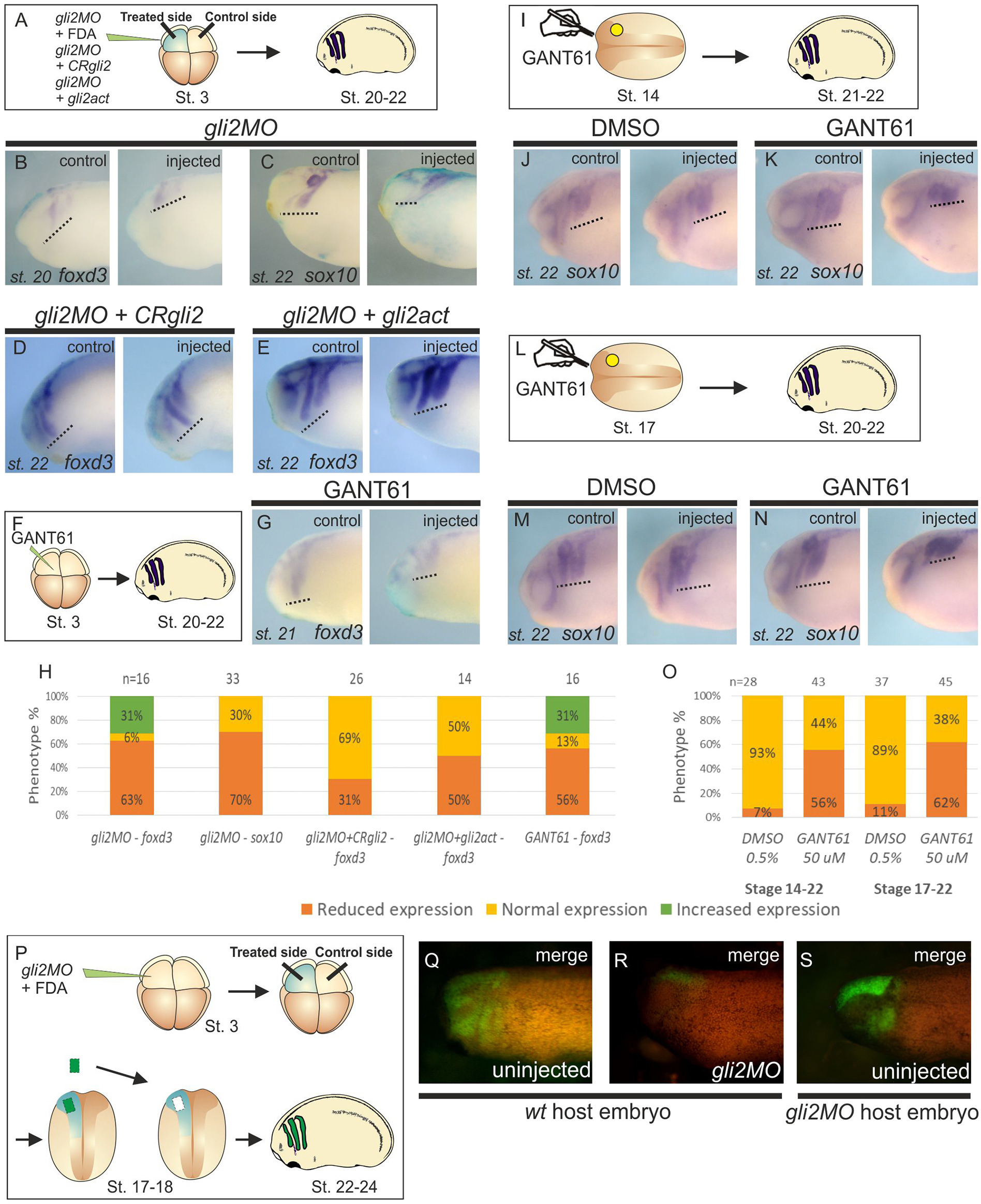 Fig. 8. gli2 acts in a cell-autonomous manner in NC migration. (BâE, G, JâK, MâN, QâS) Lateral views of embryos with the anterior side on the left showing the expression of the NC migration markers sox10 and foxd3. Figures QâS show merged images of fluorescence and bright field captures. (A, F, I, L, P) Schematic representation of the different assays. (B) Stage 20 embryos showing a reduction in the migration front in the injected side evidenced by the expression of foxd3. (C) In stage 22 embryos the difference in expression between the control and the injected side is notably higher, as evidenced by the marker sox10. (DâE) Coinjection of either CRgli2 or gli2act with gli2MO rescued NC migration as shown by foxd3 expression. (FâG) Injection of GANT61 produced a loss of gli2 function and a noticeable decrease in NC cell migration, as shown by the expression of foxd3. (H) Quantification of phenotypes shown in BâG. (IâN) Implantation of GANT61-soaked beads into NC at two different time frames (stages 14â22 and 17â22) produced a reduction in the front of migration of the NC as shown by sox10 expression. (O) Quantification of experiments shown in Figures IâN. (PâS) gli2 acts cell-autonomously in NC migration. Grafting of uninjected NC explant into an uninjected wild type embryo produced no alteration in the front of migration of the NC. The injection of gli2MO in the transplanted explant altered the normal pattern of NC migration. Grafting of a wild type NC explant into a gli2MO injected host produced no changes in normal NC migration. |
