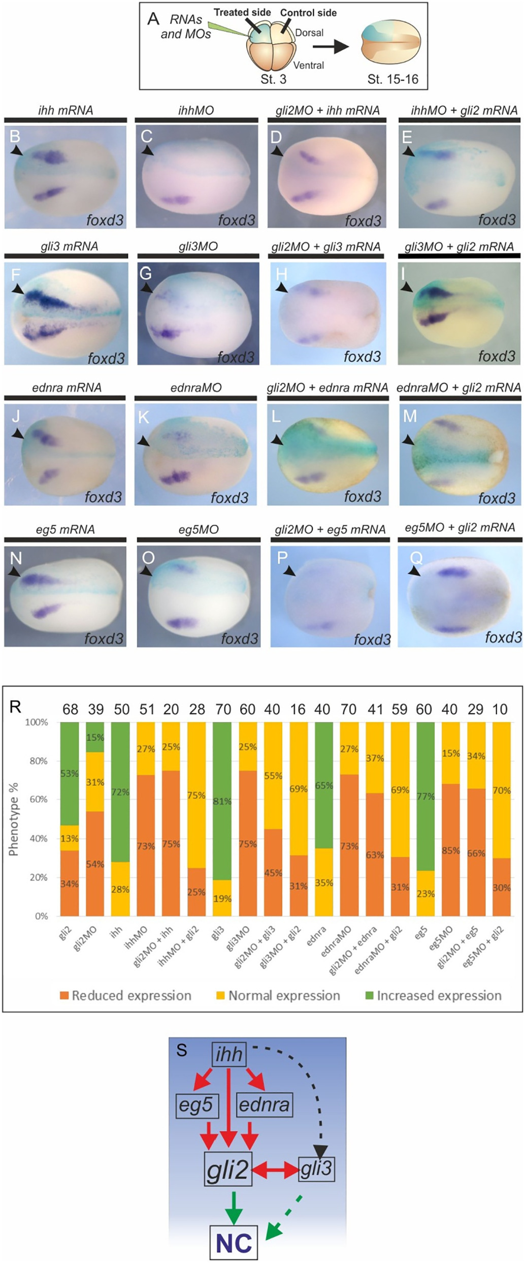 Fig. 10. gli2 epistatic relationships with ihh, gli3, ednra and eg5. (A) Schematic representation of the experiments performed. (BâQ) Dorsal views of Xenopus laevis embryos at mid-neurula stage; anterior side is on the left. Arrowheads indicate the injected side, shown in turquoise. The images show combinatorial experiments performed to evaluate the epistatic relationship between gli2 and different genes involved in the gene regulatory network that induces the NC. They also show the effect of individual genes on the NC. (BâE) gli2 is downstream of ihh during NC induction. (FâI) gli2 and gli3 rescue each other's deficiency during NC induction. (JâQ) Both genes ednra and eg5 act upstream of the gli2 transcription factor during NC induction and specification. (R) Quantification of the phenotypes shown in BâQ. (S) Hierarchy diagram plotting the epistatic relationships between the genes analyzed. |
