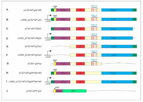Figure S1. Graphic representation of gli2 constructs used in the functional studies. (A) pCS2+MT-gli2-HIS: construct encoding the full-length Xenopus gli2 construct. (B) 3000_pCS2+MT-gli2: construct encoding gli2 full-length, which only is expressed in the NC. (C) pCS2+MT-CRgli2: construct encoding the full-length gli2 protein in which the morpholino binding sequence is altered so that gli2MO can no longer bind to the protein. (D) 3000_pCS2+MT-CRgli2: CRgli2 construct, specifically designed to be expressed in the NC. (E) pCS2+MT-gli2act: Activator form of gli2, without the repressor region. (F) 3000_pCS2+MT-gli2act: gli2act construct with expression only in the NC. (G) pCS2+MT-gli2rep: Repressor form of gli2, without the activator region. (H) pCS2+MT-gli2PSM-HIS: Construct with PKA-sites mutated. (I) 3000_pCS2+MT-CRgli2PSM: gli2PSM expressed only in NCC. (J) pCS2+GFP-gli2: Short region of gli2 fused to the GFP protein. MT: myc tag; MBS: Morpholino binding site; MBS: Codon replacement in the Morpholino binding site; N-Rep: N-terminal repressor domain (1044 bp); ZF: Zinc fingers domain; PKA1-6: Conserved PKA (protein kinase A) phosphorylation sites 1 to 6; C-Act: C-terminal activator domain (3519bp). |