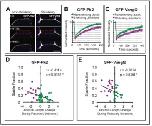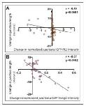 Figure 6—figure supplement 1. PCP protein localization is correlated with junctional behavior. (A) Plot of normalized GFP-Pk2 intensities versus change in junction length (r = 0.49; p<0.001; n = 71). Normalization was performed by subtracting background and expressing the intensity of GFP-Pk2 levels as the ratio to the intensity of co-expressed membrane label. (B) Plot of normalized GFP-Vangl2 intensities versus change in junction length (r = 0.57; p=0.002; n = 37). Normalization was performed as per GFP-Pk2, above. DOI: https://doi.org/10.7554/eLife.36456.019 |
