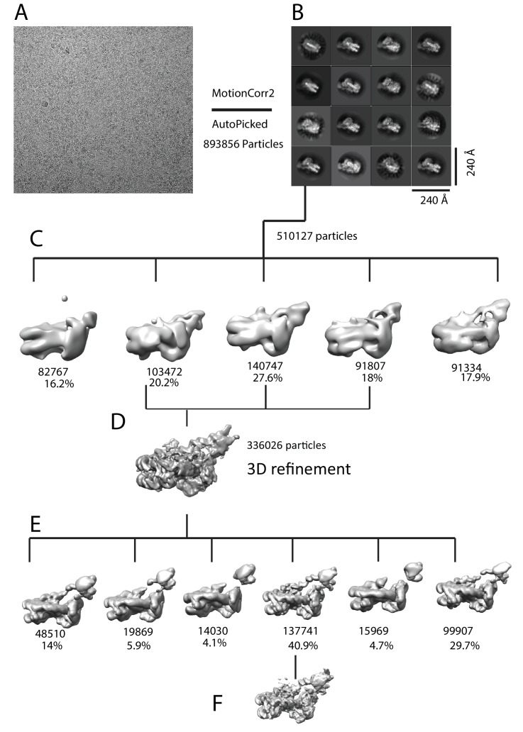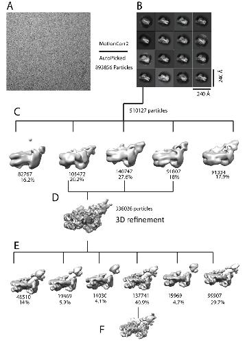 Figure 1âfigure supplement 3. Image processing for Chd1-nuclesome complex.(A) An example motion corrected micrograph. (B) 2D classification resulted in identification of 16 classes with Chd1 bound to nucleosomes. (C) Initial 3D classification resulted in five classes three of which were combined (D), reclassified (E) and refined (F). |
