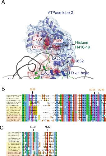 Figure 2âfigure supplement 4. ATPase lobe two interaction with histone H4 tail.(A) Fit of ATPase lobe 2, histone H3 and Histone H4 tail to density map. Residues coming into proximity with the H4 tail, D275, D279 and E669 are indicated by surface charge. The contact between ATPase lobe two and the histone H3 alpha one helix is also shown. (B) and (C) Sequence alignments show that the sequences participating in these interactions are conserved in Chd1 proteins and to some extent in Iswi and Snf2 proteins as well. |