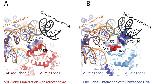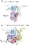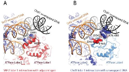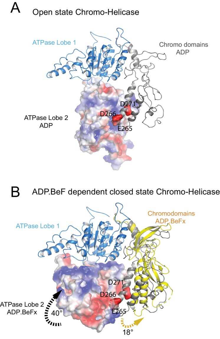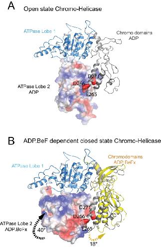 Figure 3. Closure of the ATPase lobes changes the chromodomain interaction surface.(A) The long acidic helix within chromodomain I interacts with a basic surface on ATPase lobe two in the open state (3MWY). (B) In the closed state, the basic surface on lobe two is rotated towards DNA and replaced with an acidic region. The long acidic helix within chromodomain I is repositioned away from this acidic surface. |