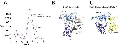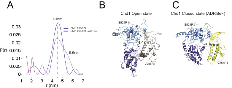 Figure 4. Nucleotide dependent reconfiguration of Chd1 chromodomains.Pulsed electron paramagnetic measurements were used to measure the distance between nitroxyl reporter groups attached to Chd1 at ATPase lobe 1 (S524) and chromodomain I (V256). (A) The probability distribution P(r) at different separations was measured in the presence (purple) and absence (blue) of ADP.BeF. The distance corresponding to the major distance is shown for both measurements. The distance corresponding to the additional distribution appears as a shoulder in the presence of ADP.BeFx and is also indicated. Modelled distances between these labelling sites in the open state (3MWY), and the closed state observed in the Chd1 bound nucleosome are indicated in (B) and (C), respectively.10.7554/eLife.35720.019Figure 4âsource data 1. PELDORDistanceDistribution.csv. |