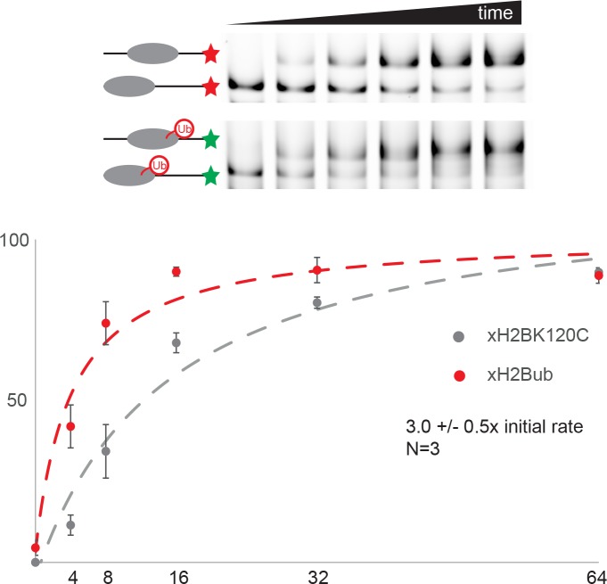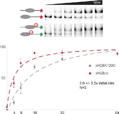 Figure 8âfigure supplement 2. Coupling ubiquitin to Histone H3 K123 directly stimulates Chd1 activity.The dual fluorescence labelling assay described for Figure 8âfigure supplement 1 was applied to study the effect of cross-linking ubiquitin to histone H3 K123. Ubiquitinylated nucleosomes were observed to be repositioned three fold faster than non ubiquitinylated nucleosomes. |