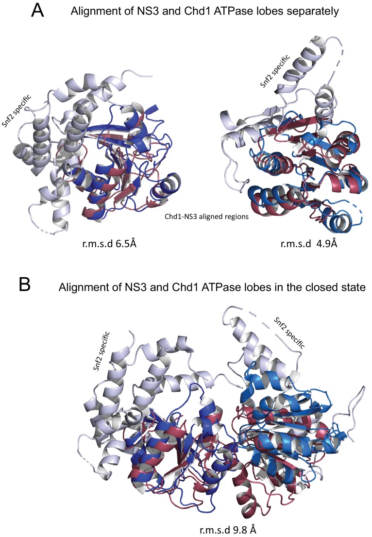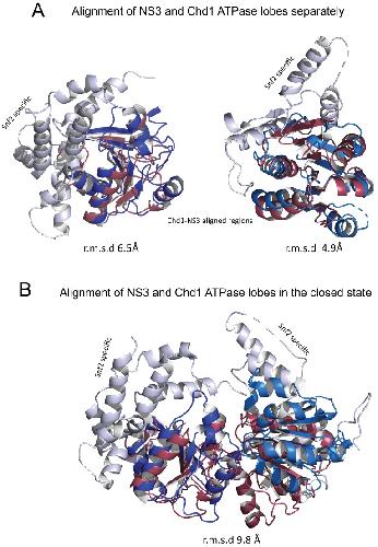 Figure 6—figure supplement 1. Comparison of NS3 and Chd1 ATPase domains.ATPase domains of Chd1 and NS3 docked individually and together. ATPase lobes 1 and 2 are shown in light and dark blue. Regions specific for Snf2 proteins are shown in white. NS3 ATPase domains in raspberry. |