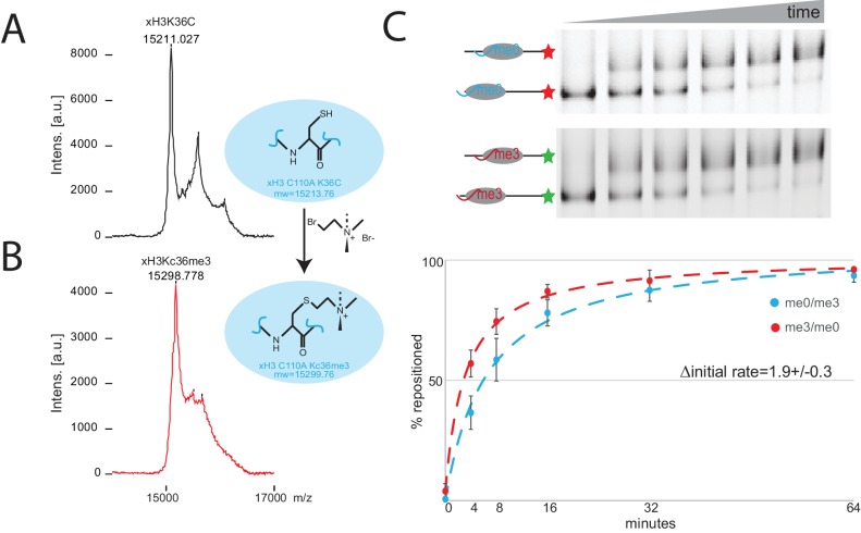 Figure 1—figure supplement 1. Preparation of nucleosomes with an alkylation mimic of histone H3 K36 methylation.Xenopus laevis histone H3K36C was alkylated to generate a mimic of trimethyl lysine (Simon et al., 2007). MALDI mass spectrometry shows that the mass of free histone H3 (A) increases by 86 Da following alkylation (B) consistent with efficient conversion. (C) Chd1 directed nucleosome repositioning was assessed using a two colour nucleosome repositioning assay in which differently modified octamers are assembled onto DNA fragments labelled with different fluorescent dyes assays. Comparison of repositioning rates from four repeats indicates that the initial rate of repositioning is 1.9 fold greater for the trimethyl mimic. |