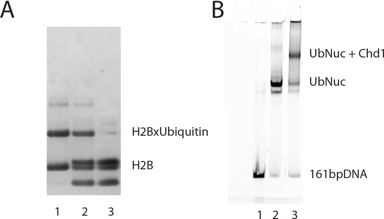 Figure 1âfigure supplement 2. Generation of nucleosomes with ubiquitin cross-linked to histone H2B K120.Ubiquitin was cross-linked to H2BK120C as described previously (Long et al., 2014; Morgan et al., 2016). Ubiquitin modified H2B was purified by ion exchange chromatography and refolded into H2A:H2Bub dimer (lane 1), and H2Bub octamer (lane 2), which is compared to native octamer (lane 3) (A). Nucleosomes were assembled on DNA including an asymmetric 14 base pair linker using ubiquitin modified H2B and alkylated H3K36. (B) The assembly of nucleosomes was assessed by native PAGE (lane 2). Incubation with Chd1 resulted in a major species consistent with binding of a single Chd1 to a nucleosome (lane 3). |