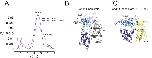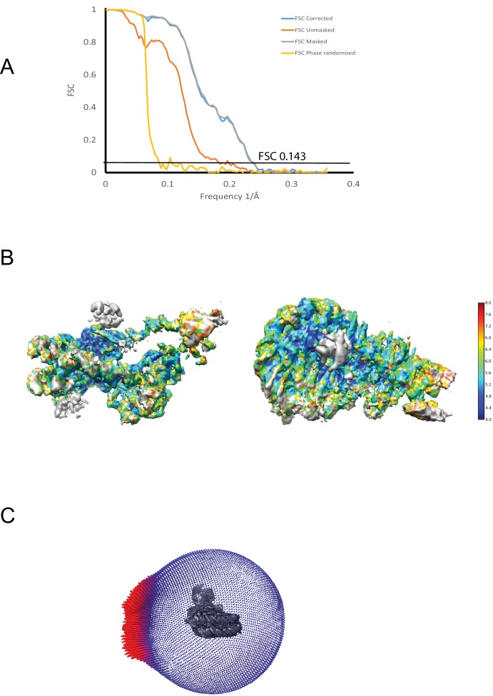 Figure 1âfigure supplement 4. Properties of the Chd1-nuclesome complex.(A) The fourier shell correlation between two half maps is plotted for corrected, unmasked, masked and phase randomised data as indicated. The average resolution was estimated from the corrected FSC at 0.143 as 4.5A. (B) Plot showing local distribution of resolution calculated from the unfiltered half maps. (C) Angular distribution of particles used for final refinement. |
