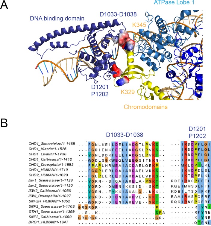 Figure 2—figure supplement 1. The chromodomain contacts with SANT and SLIDE domains.(A) Residues involved in the interactions are coloured by surface charge. (B) Sequence alignments showing conservation of residues making these contacts in Chd1 proteins. |