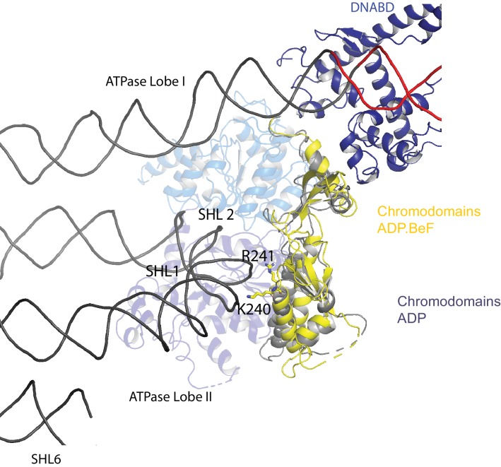 Figure 2âfigure supplement 2. Chromodomain interactions with nucleosomal DNA at SHLÂ +Â 1.Interaction of Chd1 chromodomains with nucleosomal DNA at SHLÂ +Â 1. R241 and K240 come in close contact with DNA. |