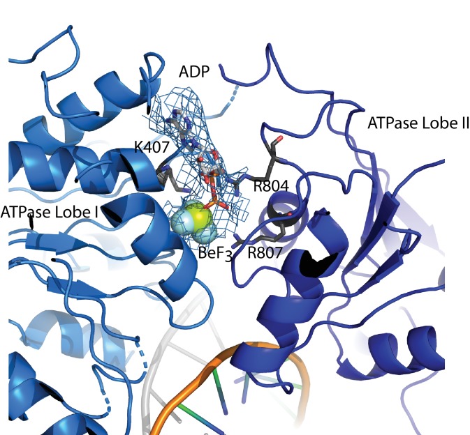 Figure 2âfigure supplement 3. The ATP binding site.ADP Berylium Fluoride fitted to density in a pocket formed by conserved residues contributed by both ATPase domains which are positioned in a closed state. Residues observed to contribute to catalysis in related proteins are well positioned to function similarly in Chd1. |