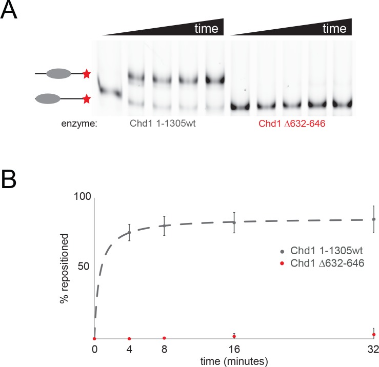 Figure 2âfigure supplement 5. Mutation of ATPase residues contacting histone H3 abolishes Chd1 activity.(A) The ability of Chd1-1305 and Chd1 1â3505 Î 632â646 to reposition nucleosomes initially located asymmetrically on 0W47 cy5 labelled DNA fragments was assessed by native gel electrophoresis. (B) Quantitation of nucleosome repositioning following triplicate repeats indicates that the deletion abolishes nucleosome sliding detectable using this assay. |