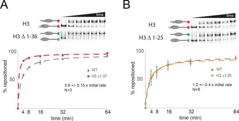 Figure 8—figure supplement 1. The histone H3 tail inhibits Chd1 activity.(A) Nucleosomes with intact H3 assembled onto 0W47 DNA fragments labelled with cy5 were mixed with nucleosomes with histone H3 truncated to K36 assembled on cy3 labelled DNA. Following repositioning by Chd1 for the times indicated repositioning of each nucleosome was assessed by scanning the gels with appropriate excitation and emission filters as shown in the top panels. Quantitation of the proportion of nucleosomes repositioned shows that H3 Δ1–37 nucleosomes are repositioned 4-fold faster. (B) The approach described in A was used to show that truncation of H3 to 25 does not affect the rate of repositioning by Chd1. |