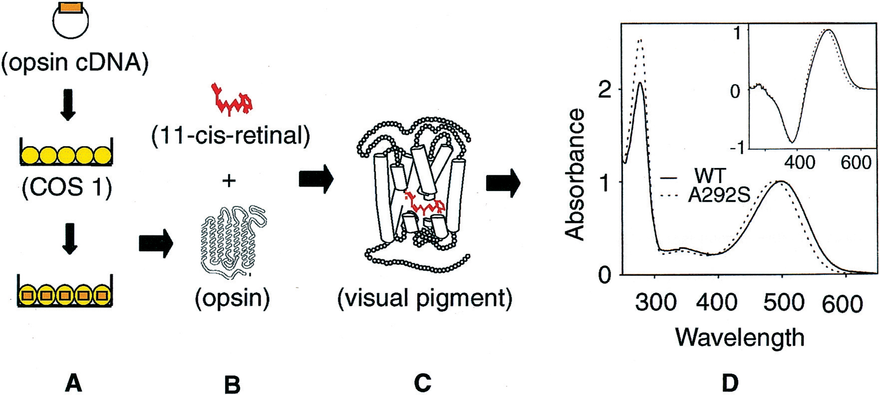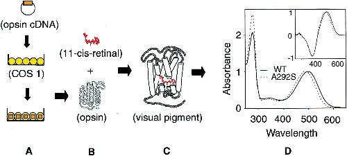 Fig. 1. In vitro assays of the absorption spectra of the wild-type and mutant bovine RH1 pigments. (A) The opsin cDNAs in an expression vector, pMT5, are expressed in COS1 cells by transient transfection. (B) The visual pigments were then regenerated by incubating the opsins with 11-cis-retinal in the dark. (C) The resulting visual pigments are then purified by immunoaffinity chromatography by using monoclonal antibody 1D4 Sepharose 4B. The absorption spectra of the visual pigment are recorded using a spectrophotometer. (D) The amino acid change A292S has been obtained by site-directed mutagenesis. The absorption spectrum in inset shows the λmax determined by dark-light spectrum.