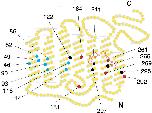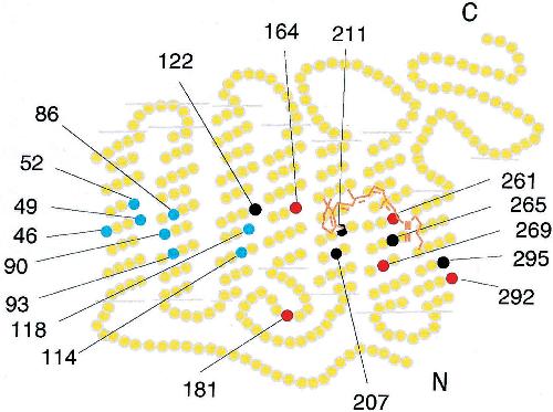 Fig. 3. Secondary structure of bovine RH1 opsin, showing naturally occurring amino acid mutations that cause significant λmax-shifts. The model is based on Palczewski et al. (2000). Blue, red and black circles indicate the amino acid sites that are involved in the spectral tuning of SWS1, LWS/MWS, and RH1/RH2 pigments, respectively. The 11-cis-retinal is shown in orange.