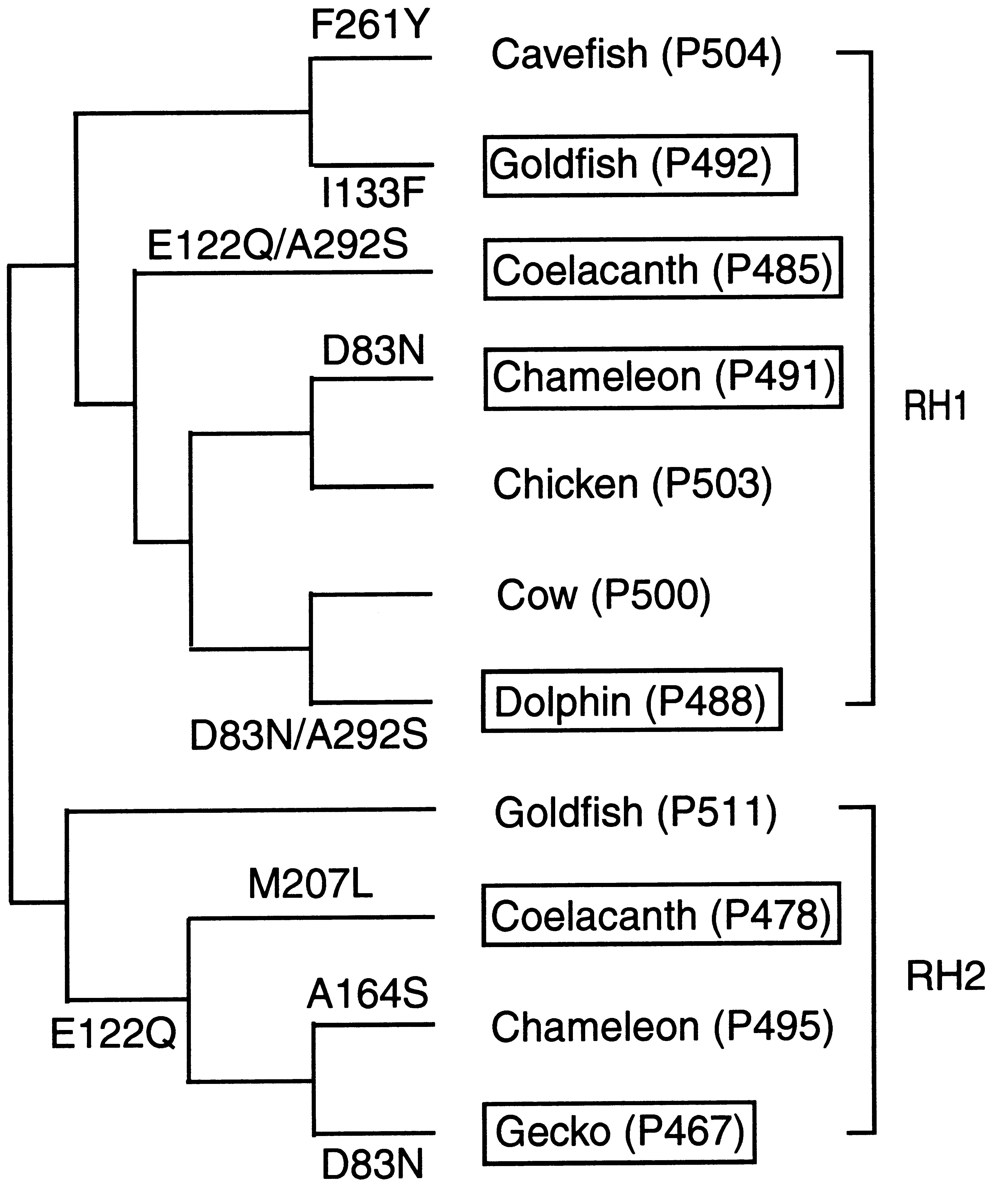 Fig. 2. A composite tree topology of selected RH1 and RH2 pigments and amino acid replacements inferred by a likelihood Bayesian method (Yang et al., 1997). The numbers after P refer to λmaxs of visual pigments. Amino acid replacements are shown next to different. The pigments with blue-shifted λmaxs are indicated by rectangles. Cavefish, Astyanax fasciatus; goldfish, Carassius auratus; coelacanth, Latimeria chalumnae; chameleon, Anolis carolinensis; chicken, Gallus gallus; bovine, Bos taurus; dolphin, Tursiops truncatus; gecko, Gekko gekko.