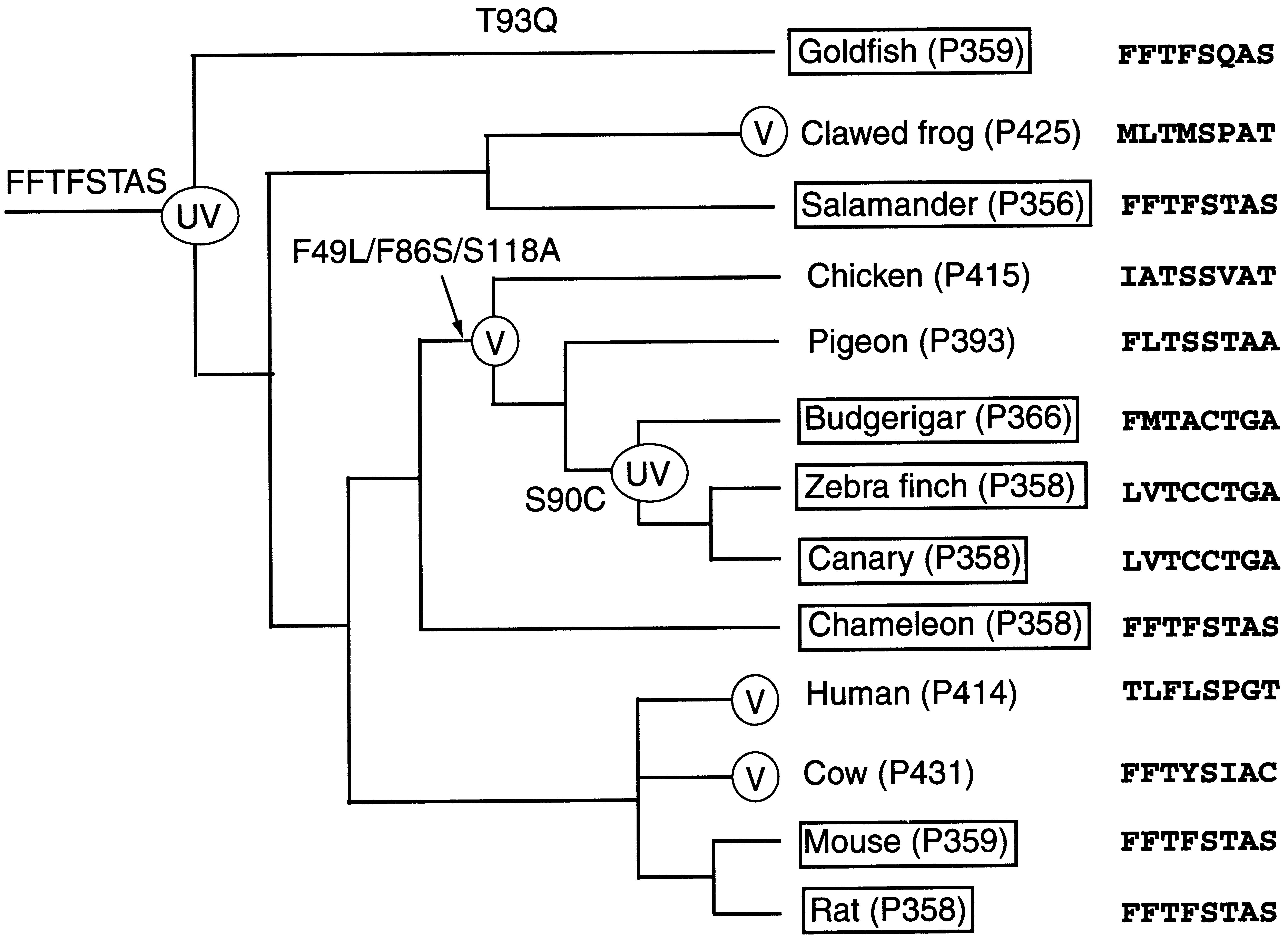 Fig. 4. A composite tree topology of selected SWS1 pigments and critical amino acid replacements at sites, 46, 49, 52, 86, 90, 3, 114, and 118, along the goldfish and avian branches. The UV pigments are boxed. UV and V indicate UV and violet sensitivities, respectively. Amino acid replacements next to the goldfish and avian branches show those at the eight critical sites. The eight letters next to the vertebrate ancestor and 13 contemporary pigments show the eight critical amino acids. Clawed frog, Xenopus laevis; pigeon, Columba livia; budgerigar, Melopsittacus undulatus; zebra finch, Taeniopygia guttata; human, Homo sapiens; mouse, Mus musculus; rat, Rattus norvegicus; and salamander, Ambystoma tigrinum. For other species, see Fig. 2.