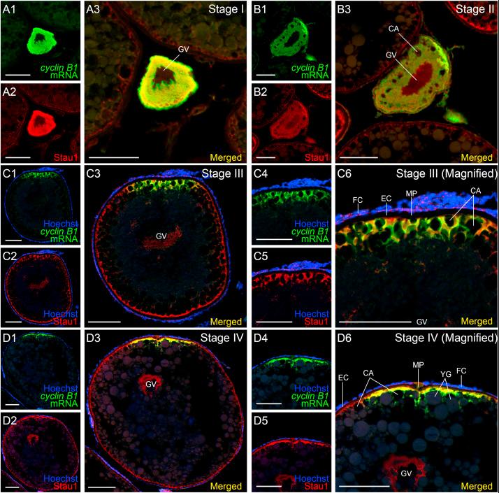 Fig. 2. Distribution of cyclin B1 mRNA and Stau1 protein during zebrafish oocyte growth. Paraffin sections of zebrafish oocytes were simultaneously analyzed by in situ hybridization and immunostaining. Hoechst 33258 staining of DNA (blue: C, D), in situ hybridization of cyclin B1 mRNA (green: A1; B1; C1, 4; D1, 4), immunostaining of Stau1 (red: A2; B2; C2, 5; D2, 5). and their merged and magnified images (A3; B3; C3, 6; D3, 6) are shown. CA, cortical alveolus; EC, egg chorion; FC, follicle cell; GV, germinal vesicle; MP, micropyle; YG, yolk granule. Scale bars, 100â¯Î¼m. (For interpretation of the references to colour in this figure legend, the reader is referred to the Web version of this article.)