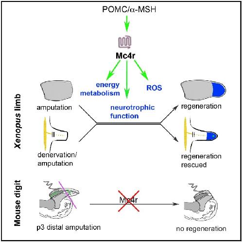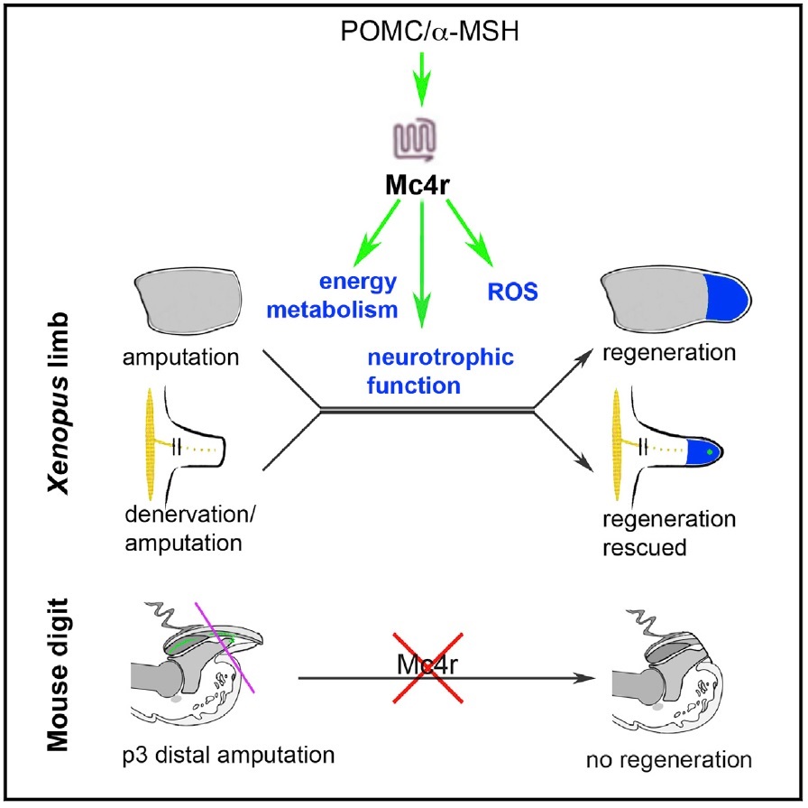 Melanocortin 4 receptor (Mc4r) plays a crucial role in the central control of energy homeostasis, but its role in peripheral organs has not been fully explored. We have investigated the roles of hypothalamus-mediated energy metabolism during Xenopus limb regeneration. We report that hypothalamus injury inhibits Xenopus tadpole limb regeneration. By loss-of-function and gain-of-function studies, we show that Mc4r signaling is required for limb regeneration in regeneration-competent tadpoles and stimulates limb regeneration in later-stage regeneration-defective tadpoles. It regulates limb regeneration through modulating energy homeostasis and ROS production. Even more interestingly, our results demonstrate that Mc4r signaling is regulated by innervation and α-MSH substitutes for the effect of nerves in limb regeneration. Mc4r signaling is also required for mouse digit regeneration. Thus, our findings link vertebrate limb regeneration with Mc4r-mediated energy homeostasis and provide a new avenue for understanding Mc4r signaling in the peripheral organs.
