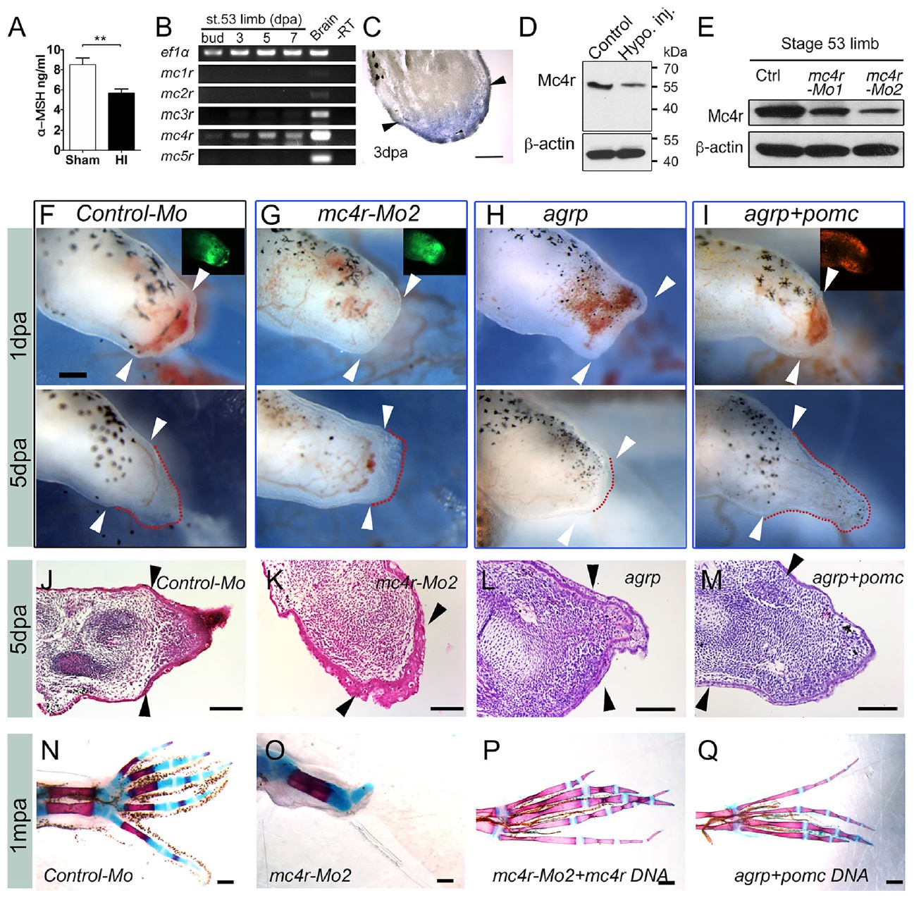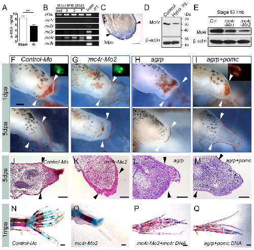 Figure 2. Xenopus Tadpole Limb Regeneration Is Regulated by Mc4r Signaling (A) ELISA shows a decreased level of a-MSH in hypothalamus-injured tadpole limb stumps, 3 dpa. Error bars: standard derivation. **p < 0.01, Studentâs t test, n = 3. (B) Expression of melanocortin receptors in Xenopus laevis by RT-PCR. (C) Detection of Mc4r transcripts by in situ hybridization in limb regenerate of a stage (st.) 53 tadpole. Mc4r mRNA is shown in purple blue. (D) Western blot detection of Mc4r in limb stumps of sham-operated or hypothalamus-injured stage 53 tadpole limb stumps, 3 dpa. Western blotting images shown are representatives for 3 independent experiments. (E) Western blot detection of Mc4r in st. 53 limb stumps, showing effective knockdown of Mc4r by mc4r-Mo1 and mc4r-Mo2. (FâI) Blastema formation in st. 53 tadpole limb is inhibited by mc4r-Mo2 or agrp and can be rescued by the overexpression of pomc DNA. Stump/regenerate of control (F), mc4r-Mo2-injected (G), agrp-injected (H), and agrp+pomc co-injected (I) limbs are shown. Red dotted lines indicate regeneration area. Insets in (F), (G), and (I) indicate efficient delivery of morpholino or DNA constructs. (JâM) Hematoxylin and eosin staining on sagittal sections of limb stump (5 dpa). (NâQ) Skeletal preparations of tadpole limbs injected with control-Mo, mc4r-Mo2, mc4r-Mo2 + mc4r DNA, and agrp + pomc DNA. White arrowheads (FâI) and black arrowheads (JâM) indicate amputation levels. Scale bars, 0.1 mm in (B)â(M); 1 mm in (N)â(Q). dpa, day post amputation. See also Table 1 and Figures S1 and S2. |