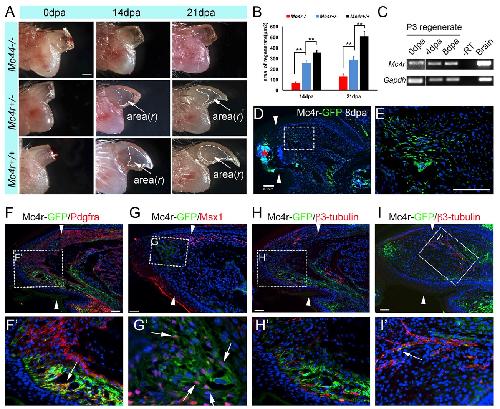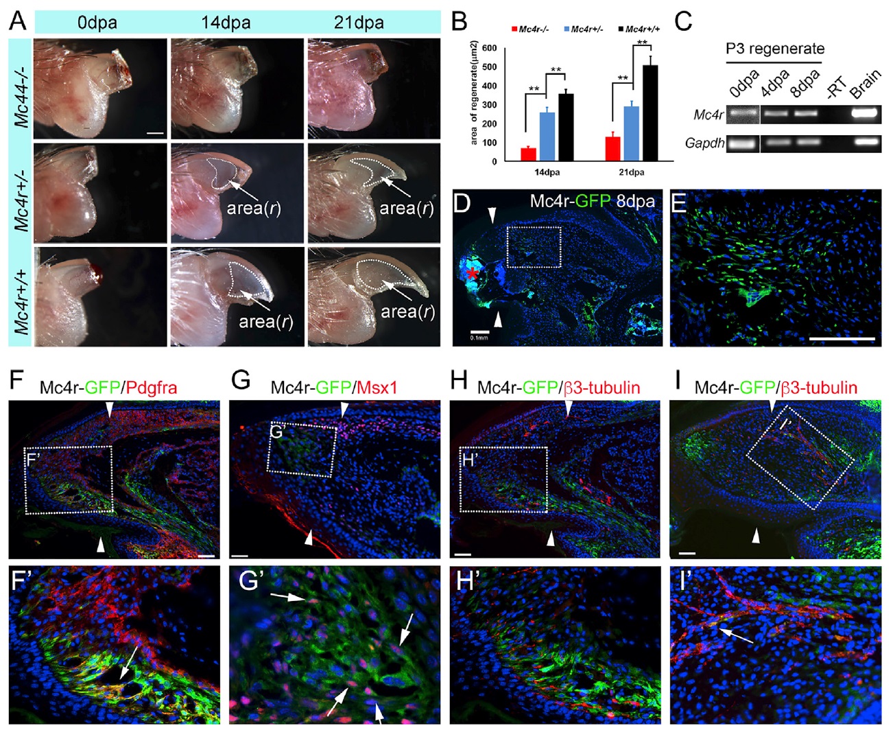 Figure 4. Mc4r Is Expressed in the Mouse Digit and Is Required for Digit Tip Regeneration (A and B) Digit tip regeneration is inhibited in Mc4r-/- mouse and delayed in Mc4r+/- mouse. White dotted lines in (A) indicate the area of regeneration (r), which was measured (4 digits in each group) to obtain the data shown in (B). Error bars: standard derivation. ** indicates significant difference, Studentâs t test. (C) Detection of the mc4r transcript by RT-PCR in wild-type mouse digit tip and the regenerates. dpa, day post amputation. (D and E) GFP expression in the digit tip regenerate of mc4r-gfp transgenic mice, 8 dpa. (E) is an enlarged area outline in (D). GFP+ cells are accumulating in the digit regeneration blastema. * indicates the scab, which will fall off around 12 dpa. (FâI) Detection of PDGFRa, Msx1, and b3-tubulin in the mouse digit blastema, 8 dpa. GFP shown in green, and PDGFRa, Msx1, and b3-tubulin are shown in red. (FʹâIʹ) Enlarged view of areas marked by white dotted lines. Arrows indicate examples of PDGFRa+ GFP cells (Fʹ), Msx1+ GFP cells (Gʹ), and b3-tubulin+ GFP cells (Iʹ). White arrowheads indicate the digit amputation levels. Scale bars represent 0.5 mm in (A) and 0.1 mm in (D)â(I). See also Figure S4. |