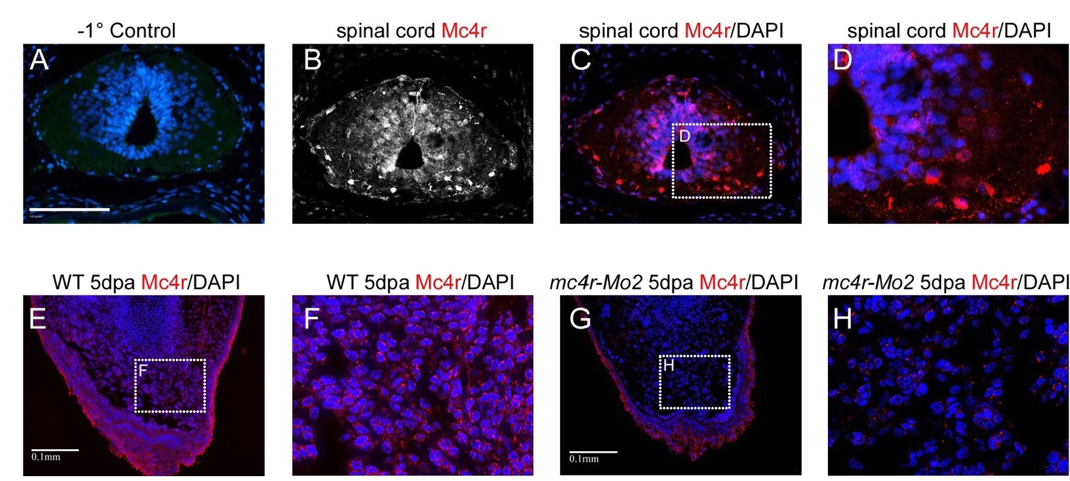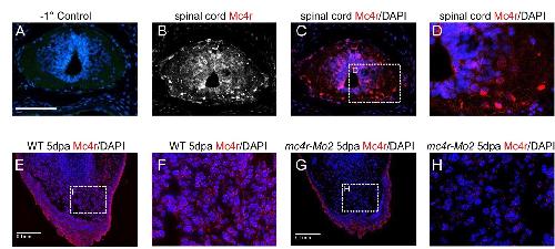 Fig. S2 Detection of Mc4r by immunofluorescence in tadpole spinal cord, and limb stumps, Related to Figure 2. (A-D) Immunofluorescence staining of Mc4r on cross sections of stage 53 tadpole spinal cord. Section incubated without primary antibody (-1Ëcontrol, A) shows no signal after incubation with secondary antibody. (B,C) Section with both primary and secondary antibody incubation, Mc4r signals shown in red, nuclei counterstained with DAPI shown in blue. (D) Enlarged view of the area marked by dotted line in (C). (E-H) Mc4r immunofluorescence staining on sagittal sections of 5 dpa limb stump, injected with control (E,F) or mc4r-Mo2 (G,H) morpholino oligonucleotides, showing decreased expression of Mc4r by mc4r-Mo2 in the limb mesenchyme (blastema), but not in the epithelium. (F,H) Enlarged views of the areas marked by dotted lines in (E,G). Scale bars: 0.1mm. Related to Fig. 2. |
