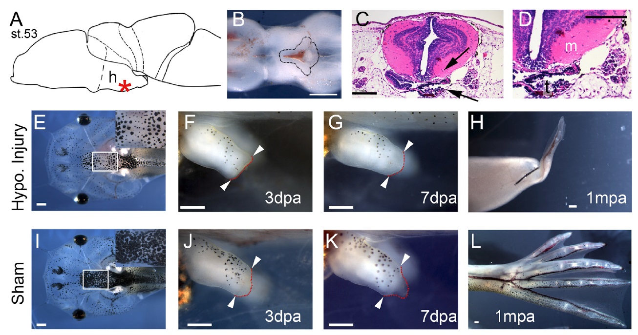 Figure 1. Hypothalamus Injury Inhibits Xenopus Tadpole Limb Regeneration (AâD) Hypothalamus injury by electrocautery in Xenopus tadpole. (A) is a diagram of a lateral view of a stage 53 tadpole brain. * shows the injury site of the hypothalamus (h). (B) is a ventral view of a stage 53 tadpole brain, showing the basal region of the hypothalamus (the black dotted line marks the expression domain of pomc and mc4r transcripts shown in Figure S1). (C) is a cross section of a hypothalamus-injured tadpole brain region. Black arrows indicate the damaged hypothalamus. (D) is an enlarged view of the injury site, showing disorganization of the tuberal (t) and the mammillary (m) region of the basal hypothalamus. (EâG) Examples of a hypothalamus-injured tadpole with reduced pigmentation (E) and inhibited limb regeneration at 3 and 7 days post amputation (dpa); (F) and (G), 16/20. (H) An example of a hypothalamus-injured tadpole limb, at 1 month post amputation (mpa), with one digit regenerated (5/20). More than half of the hypothalamus injured tadpoles failed to regenerate any digit (11/20); some regenerated only one digit (5/20) or two digits (4/20). (IâK) A sham-operated tadpole with normal pigmentation (I) and limb regeneration at 3 dpa (J) and 7 dpa (K). (L) An example of sham-operated control tadpole limb, at 1 mpa, with 5 digits regenerated (17/20). Some control tadpoles regenerated 4 digits (3/20). Red dotted lines demarcate regenerated regions. White arrowheads indicate amputation levels. Scale bars, 0.2 mm. |