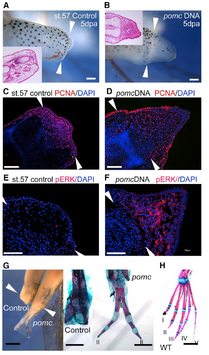 Figure 3. Elevation of Mc4r Signaling Stimulates Limb Regeneration in Stage 57 Regeneration-Defective Tadpoles (A and B) Non-regenerating st. 57 tadpole limbs (A) can be stimulated to regenerate by injection and electroporation of pomc DNA (B) 5 days post amputation (dpa). Insets in (A) and (B) are hematoxylin and eosin staining on sagittal sections of the respective limb stumps. (C and D) Detection of proliferating cells by PCNA immunofluorescence in control (C) and pomc DNA-injected (D) limb at 5 dpa. PCNA signal is shown in red. Nuclei are shown in blue. (E and F) Detection of pERK1/2 in the control limb (E) and pomc DNA-injected limb (F) at 5 dpa. pERK1/2 signal is shown in red. Nuclei are shown in blue. (G) Ventral view of a tadpole with pomc DNA injected in the left hindlimb at st. 57, and skeletal preparation of this tadpoleâs limbs. 1 month post amputation. pomc DNA injected tadpole tend to regenerate mirrored digits I and/or II. (H) Skeletal preparation of an un-amputated tadpole hindlimb showing the pattern of digits (I to V). White arrowheads indicate amputation levels. Scale bars represent 100 mm in (A) and (B), 50 mm in (C)â(F), and 1 mm in (G) and (H). See also Table 1. |