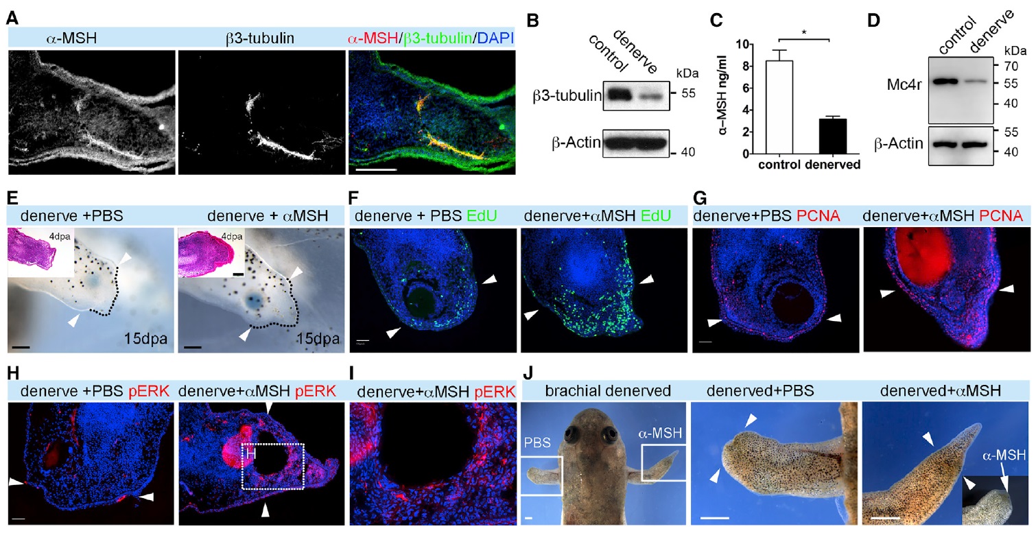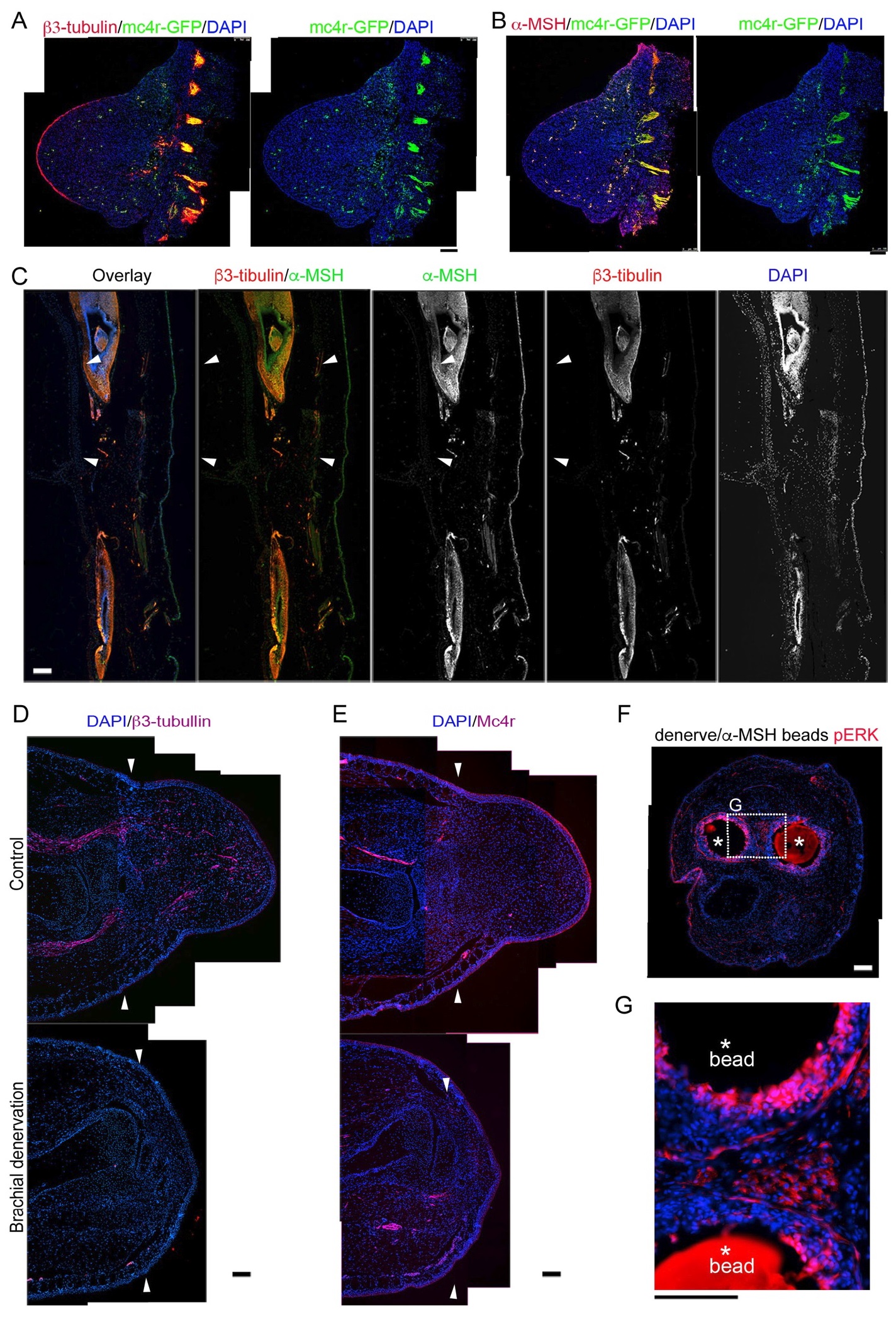 Fig. S5 Mc4r is regulated by innervation, Related to Figure 5. (A,B) Expression of a-MSH, Mc4r-GFP, and b3-tubulin on coronal section of E10.5 Mc4r-gfp mouse embryonic limb . a-MSH and b3-tubulin are shown in red, Mc4r-GFP reporter signals are shown in green. Counterstaining with DAPI is shown in blue. Scale bar: 0.1 mm. (C) Detection of a-MSH and b3-tubulin on sagittal section of transacted spinal cord shows the successful removal of spinal nerve in st.53 tadpoles. White arrowheads indicate the spinal cord transaction site. (D,E) Detection of b3-tubulin and Mc4R in control and denervated frog forelimb stumps shows diminished b3-tubulin in denervated limb, and reduced Mc4r in denervated limb stump. White arrowheads indicate amputation levels. (F,G) Detection of pERK1/2 on cross sections of limb stump implanted with a-MSH beads (marked by *). pERK1/2 is shown in red. Scale bars: 0.1mm. Related to Fig. 5. |