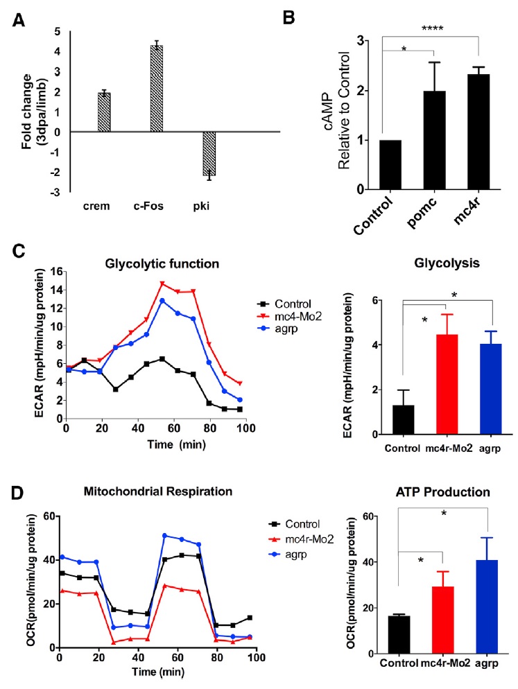 Figure 6. Mc4r Signaling Regulates Energy Metabolism in Xenopus Limb Cells (A) Relative expression of cAMP pathway components crem, c-fos, and pki in st. 53 tadpole limb regenerates, 3 dpa, normalized to st. 53 tadpole limb bud. Error bars: standard derivation, n = 3. (B) cAMP levels in control, mc4r-injected, and pomc-injected 3dpa tadpole limb regenerates, 3 dpa. Data from 3 independent luciferase assays on limb regenerate lysis, each with 12â15 limb regenerates. * p < 0.05, **** p < 0.001. Error bars: standard derivation. (C) The Agilent Seahorse XF Glycolysis stress test demonstrates an increase in glycolytic response in agrp DNA-injected and mc4-Mo2-injected limb cells, showing increased glycolysis stress in agrp- and mc4r-Mo2-injected cells. Serial injections of glucose (10 mM), oligomycin (1 mM), and 2-DG (100 mM) was performed in the Glycolysis stress test. * indicates p < 0.05, Studentâs t test, data collected from 3 independent tests, each with 20 limbs. Error bars: standard derivation. (D) Agilent Seahorse XF Cell Mito Stress test of control, agrp DNA-injected, and mc4-Mo2-injected limb cells demonstrates changes of mitochondrial function and ATP production by agrp and mc4r-Mo2. * indicates p < 0.05, Studentâs t test, data collected from 3 independent tests, each with 20 limbs. Error bars: standard derivation. |