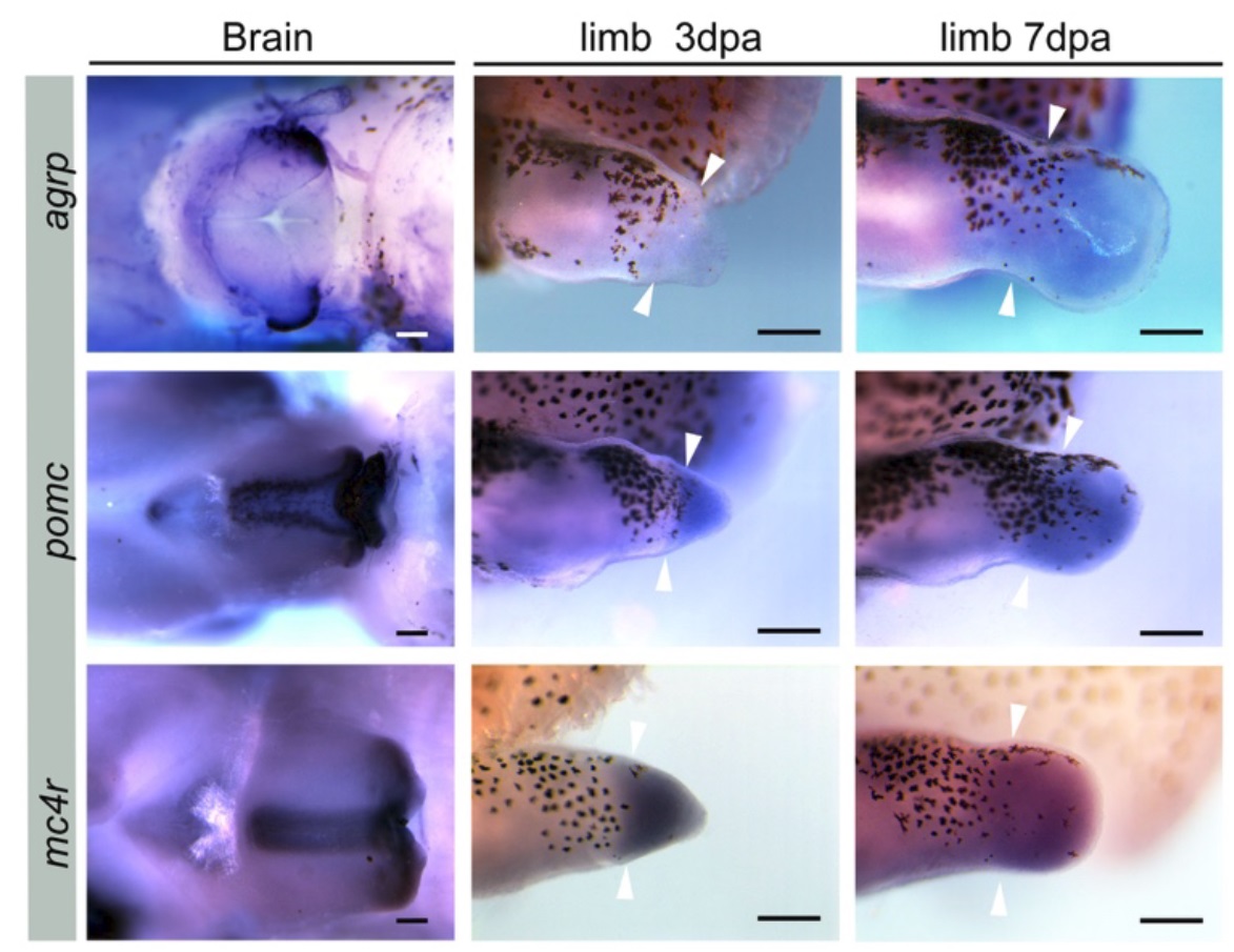 Fig. S1 Detection of agrp, pomc and mc4r transcripts in Xenopus brain and limbregenerates, Related to Figure 1. Whole mount in situ hybridization (WISH) of pomc, agrp, and mc4r in Xenopus tadpole brain and tadpole limb regenerates amputated at stage 53. Limb regenerates were collected at 3 and 7 days post amputation (dpa). Arrowheads indicate amputation levels. Related to Fig. 1. |